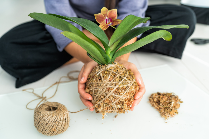 Naudodami virvelę, apvyniokite samanų rutulį kryžminiu būdu, kad viskas būtų kartu saugiai. Virvelė ne tik išlaiko samanas vietoje, bet ir suteikia dekoratyvumo kokedama. Atlikdami šį veiksmą galite būti kiek tik kūrybingi, kurdami raštus su virvele arba laikydamiesi jos paprastumo ir kaimiškumo.